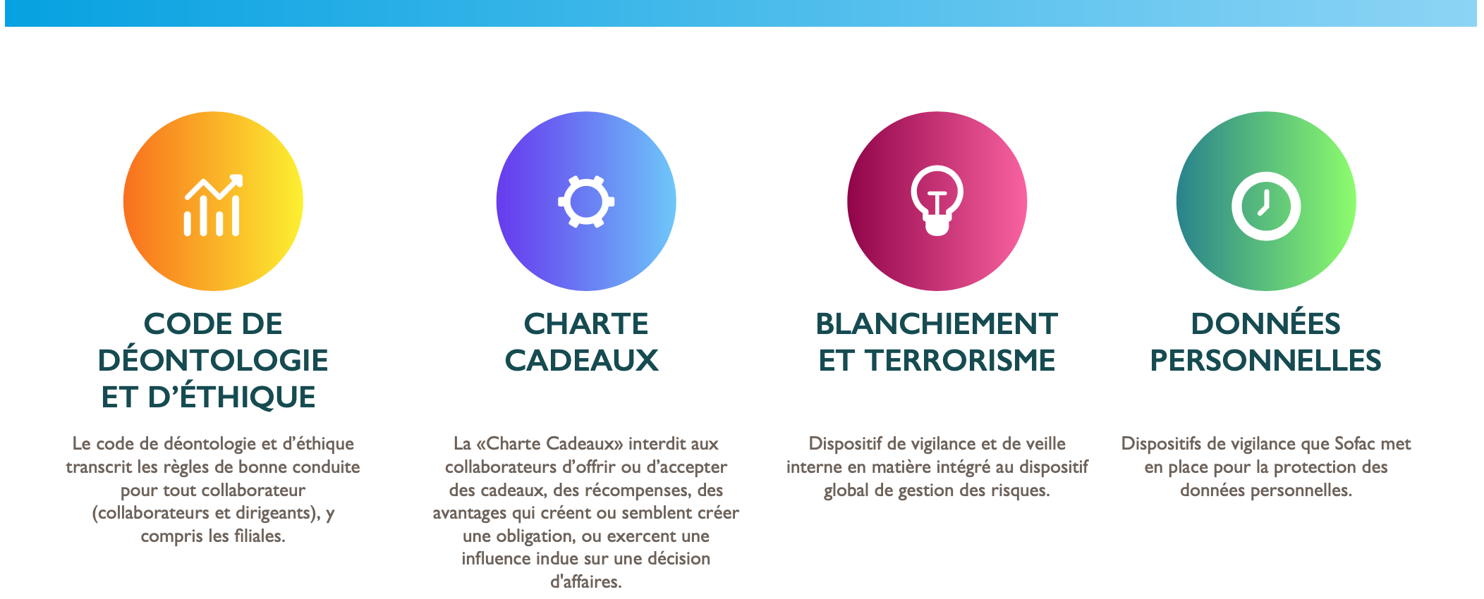 Par conséquent, Sofac s’appuie sur les dispositions de « la charte cadeaux », dont le principe fondamental est que les collaborateurs ne peuvent ni offrir ni accepter de cadeaux, de récompenses, d'avantages qui créent ou semblent créer une obligation, ou exercent une influence indue sur une décision d'affaires ou d'ordre opérationnel.