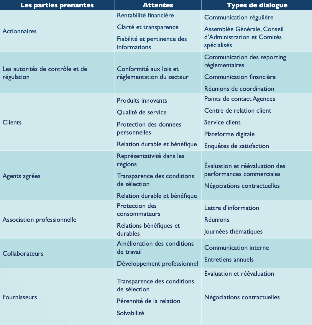 A l'issue de la prochaine consultation des parties prenantes, Sofac communiquera les résultats de cette consultation au Conseil d'Administration. Sofac communiquera à l'organe de gouvernance, également, les enjeux économiques, environnementaux et sociaux relatifs à l'analyse de matérialité.